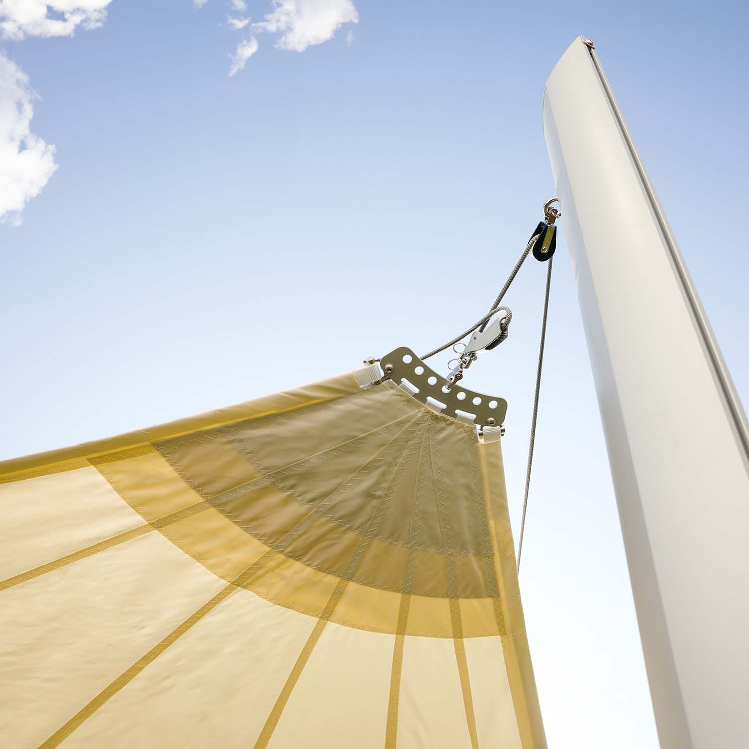 Enthaltene Komponenten Spannungssystem Federgruppe, Seilrolle, Umlenkrollen an den Segel-Ecken, Spannseil, Auslegerhalterung