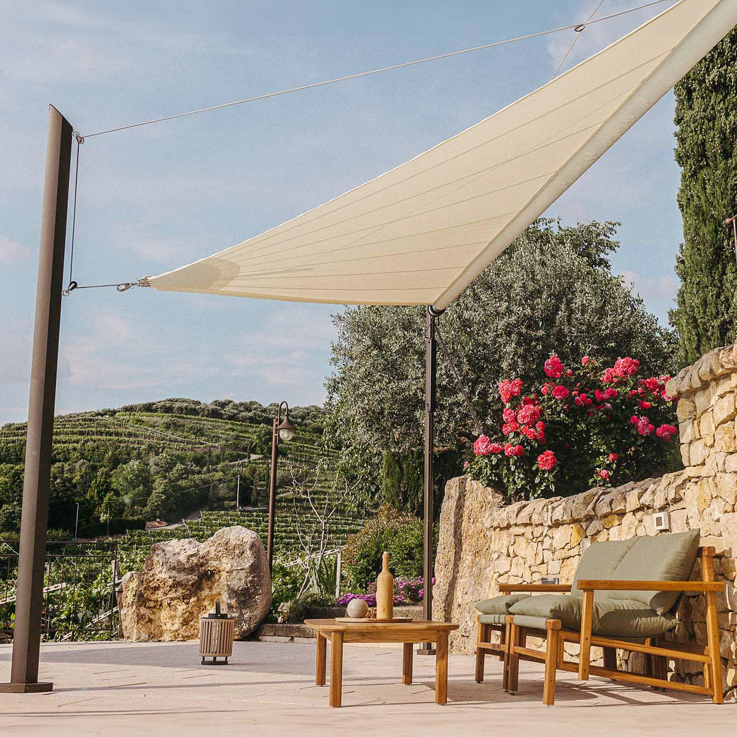 Dieses elektrische Sonnensegel benötigt speziell von Maanta entwickelte Masten mit Platten, die für das motorisierte Befestigungssystem ausgelegt sind. Wenn Sie bereits andere Masten besitzen, können diese leider nicht mit Zefira verwendet werden.