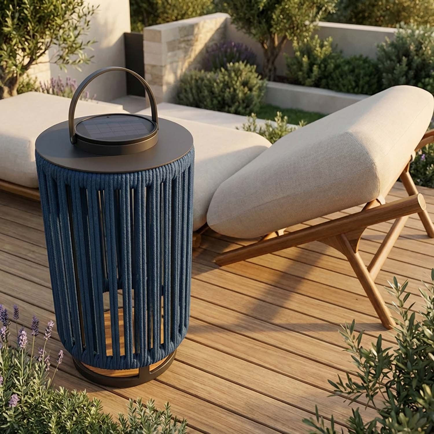 Marinea ist eine tragbare Solar-Außenleuchte mit radial geflochtenem Nylonseil und Teakholz-Basis.