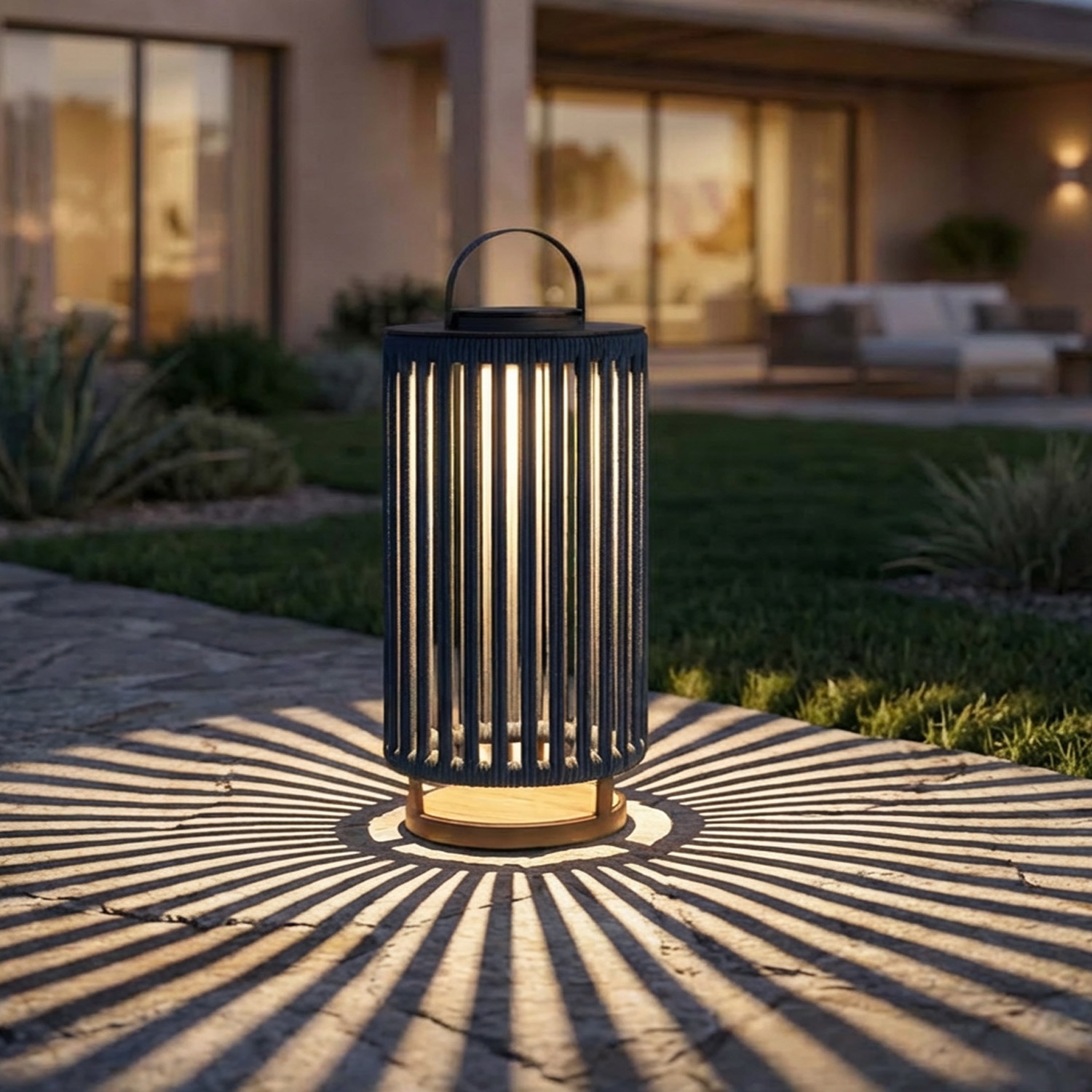 • Durchdachte radiale Schatten: Das geflochtene Seil erzeugt ein strahlenförmiges Lichtspiel, das den Außenbereich verwandelt