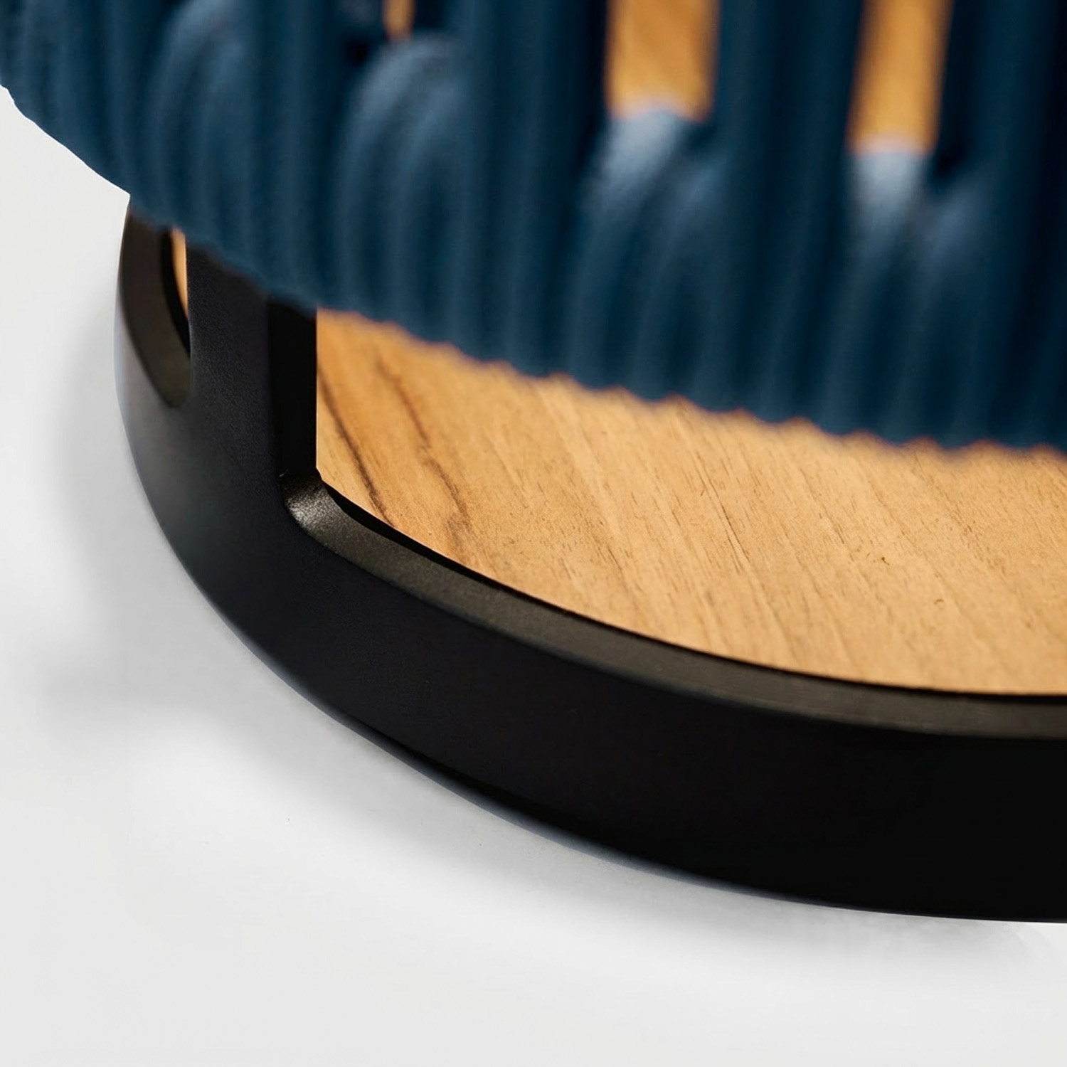 Das Seil ist in vier Farben erhältlich: Terracotta, Dark Blue, Pebble Grey, Olive Beige. Die Aluminiumstruktur ist stets in mattem Schwarz gehalten. Die Teakholz-Basis hat eine natürliche Farbe.