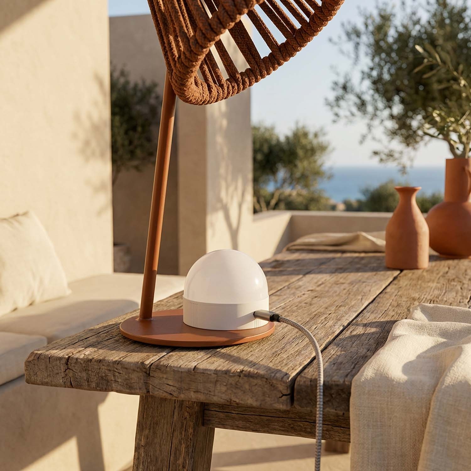 Mini Ropelle ist eine wiederaufladbare Tischlampe ohne Kabel, mit geflochtenem Seil aus Polypropylen-Olefin – ein Material, das sich besonders für Outdoor-Produkte eignet und nicht ausbleicht sowie Regen, Sonne und salzhaltiger Luft standhält. Die magnetische Mag-Glühbirne lässt sich mit einer einfachen Bewegung abnehmen und separat über USB-C aufladen, ohne die Lampe von ihrem Platz zu bewegen. Für Gärten, Terrassen, Wohnbereiche und Schreibtische: stimmungsvolles Licht ganz ohne Kabel – perfekt auch für Außenbereiche in Deutschland und Österreich.
