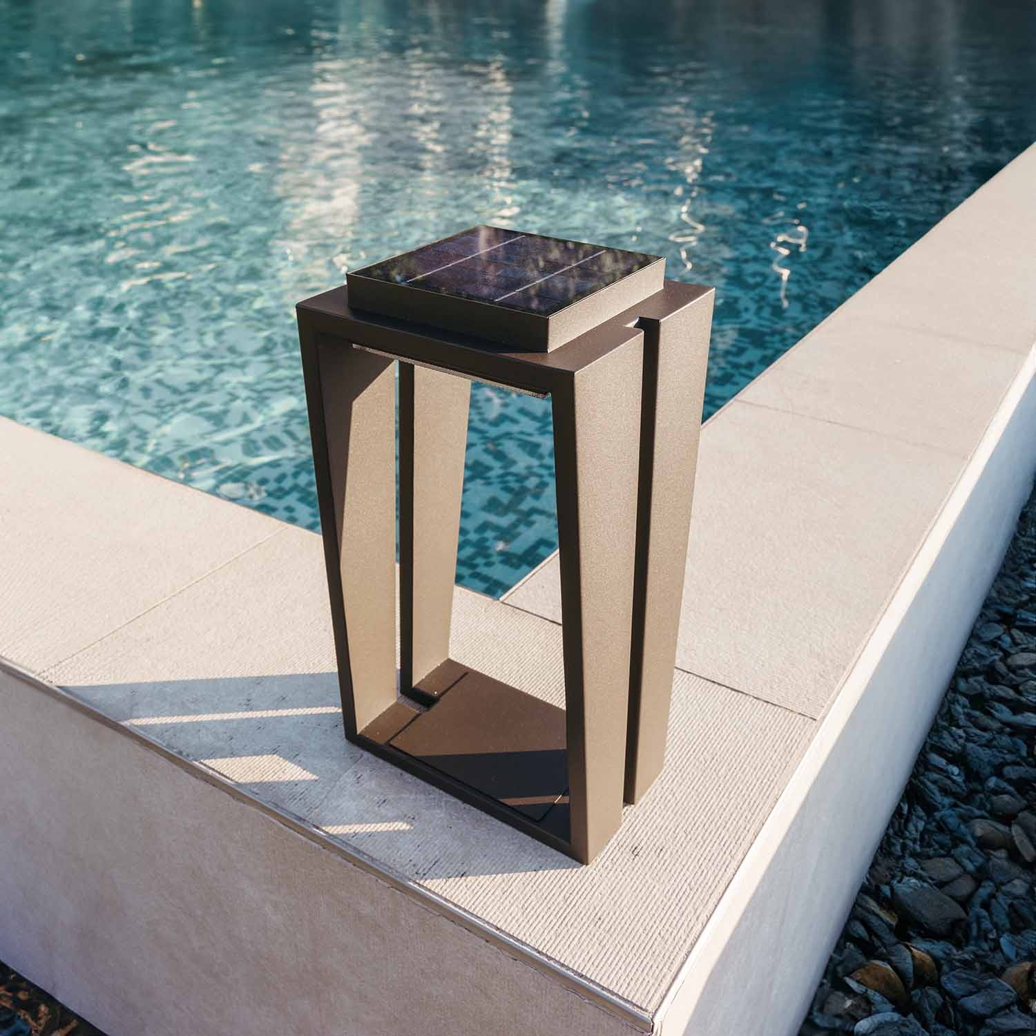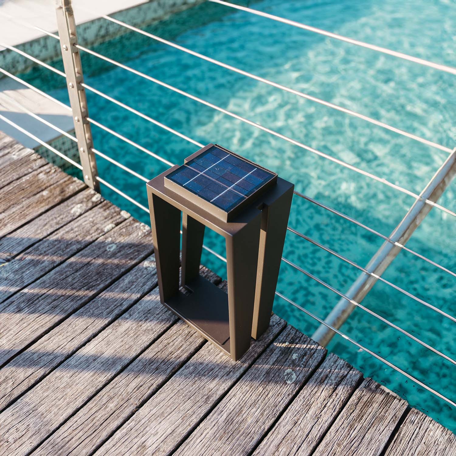 Solar ISOSS ist eine designstarke Außenleuchte mit integriertem Solarpanel und Lithiumbatterie.