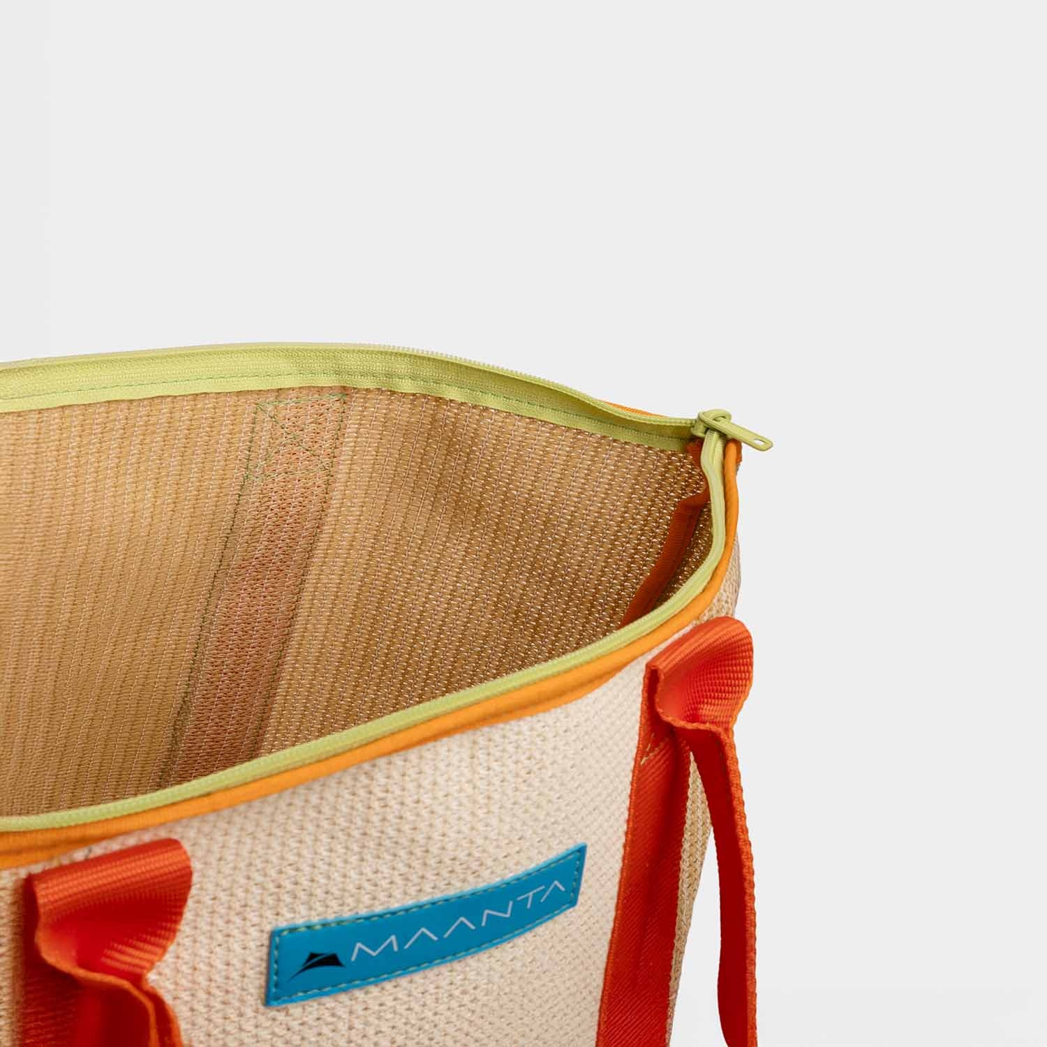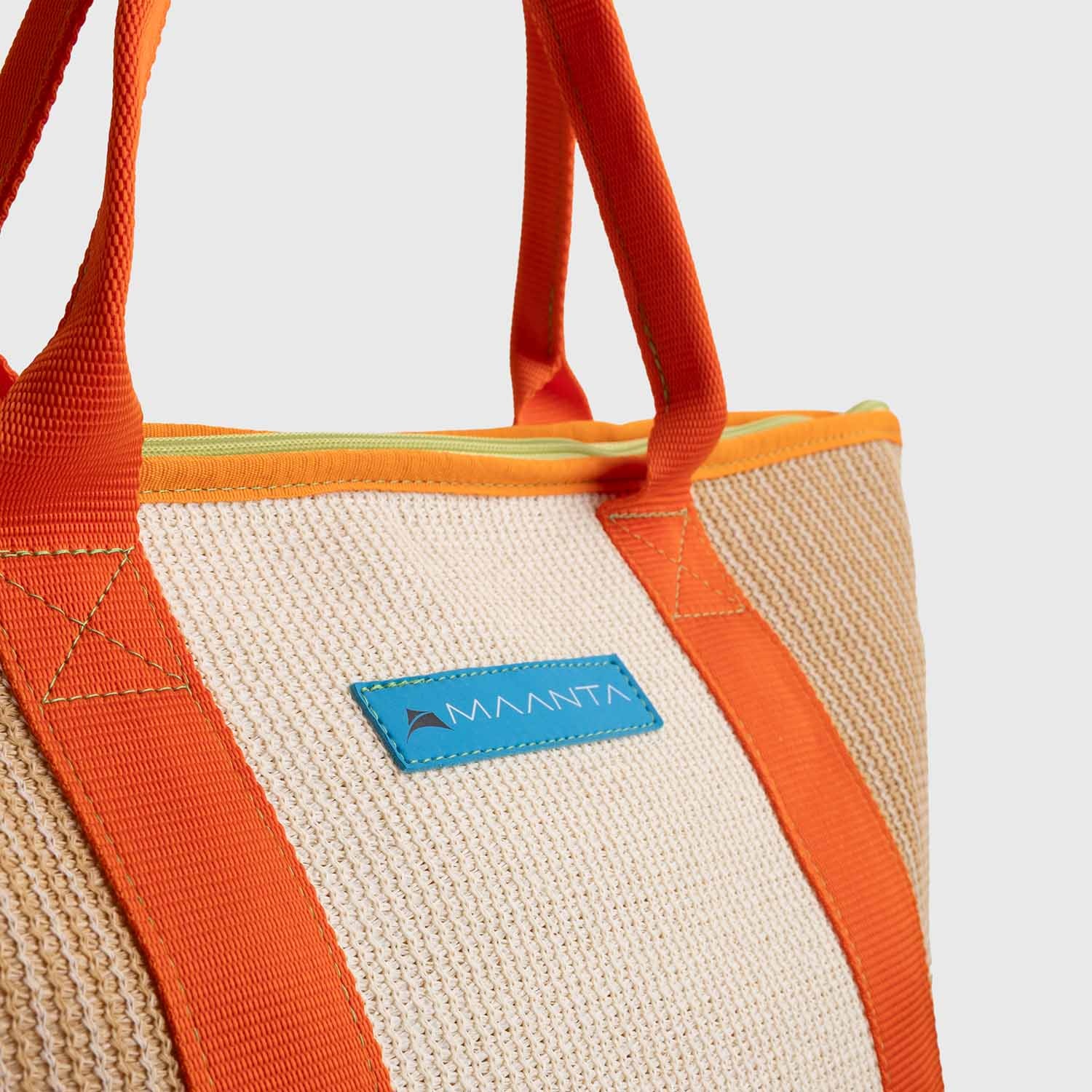 Zweifarbige Strandtasche mit orangefarbenen Einsätzen und grünen und blauen Details, bequemen Stoffgriffen, Reißverschluss oben.