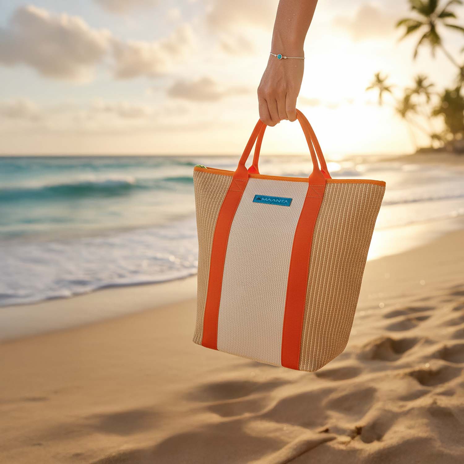 Zweifarbige Strandtasche mit orangefarbenen Einsätzen und grünen und blauen Details, bequemen Stoffgriffen, Reißverschluss oben.