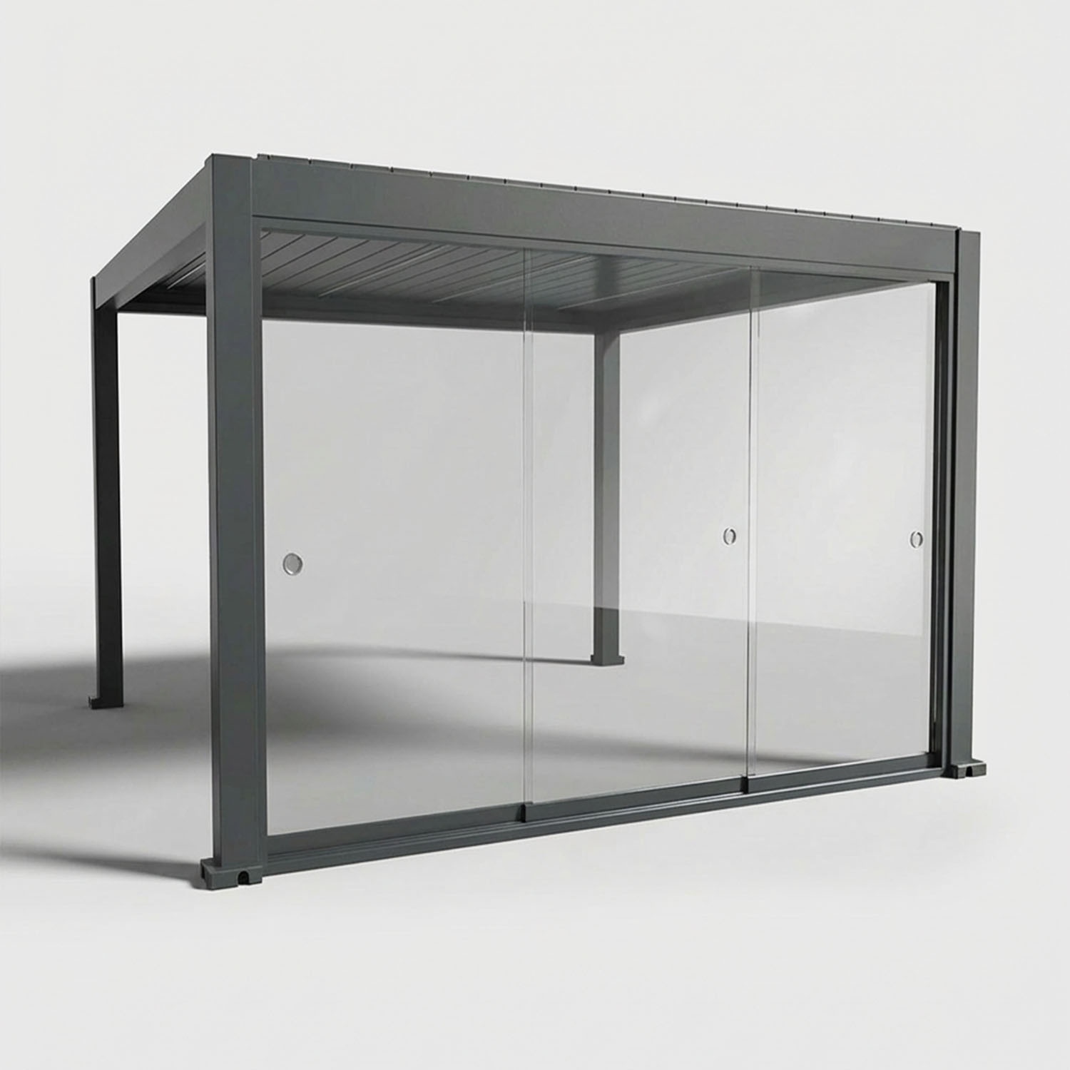 Es handelt sich um verschiebbare Abschlüsse aus gehärtetem Glas, die speziell für die bioklimatische Pergola Lyra T6 von Maanta entwickelt wurden. Sie verwandeln die Pergola in einen vor Wind und Regen geschützten Raum, der das ganze Jahr über nutzbar ist. Das System ist „rahmenlos“, da es keine sichtbaren vertikalen Profile zwischen den Paneelen gibt.