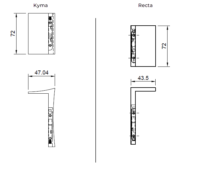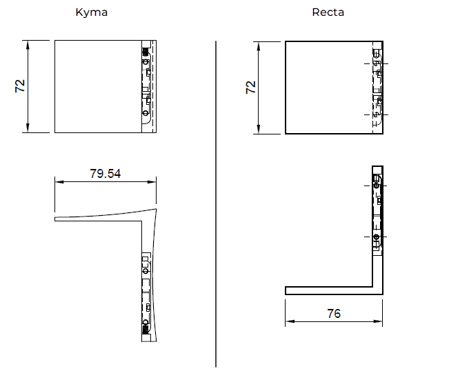 Kyma und Recta sind in allem identisch – mit Ausnahme des Designs der dekorativen Platte. Recta hat klare, geometrische Linien für alle, die einen minimalistischen Stil bevorzugen, während Kyma ein weiches, wellenförmiges Profil besitzt. Leistung, Stoffe, Maße und Preise sind identisch.
