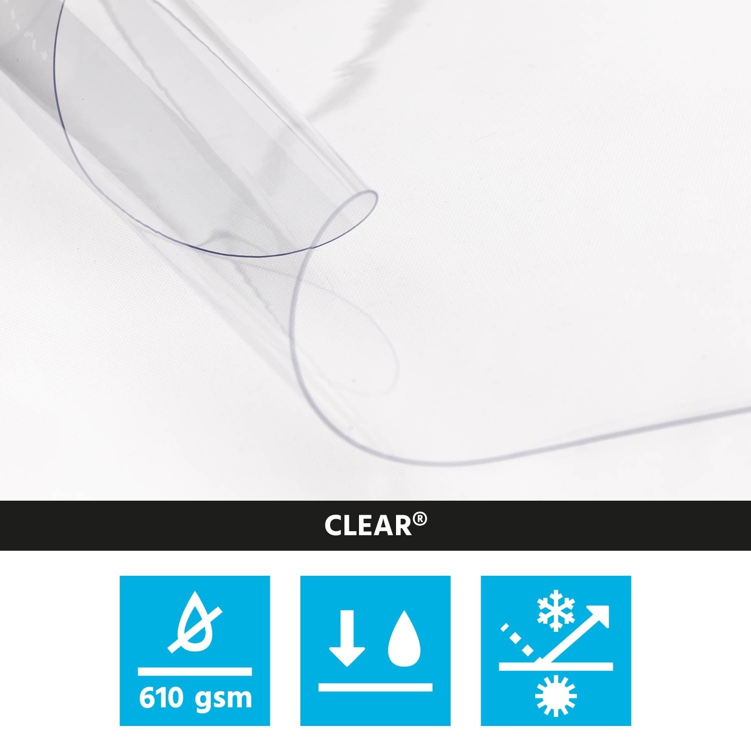 Transparente PVC-Folie. Äußerst leicht, wetter- und UV-beständig. Clear® ist außerdem ein hervorragender Wärmeisolator und frei von schädlichen Chemikalien.