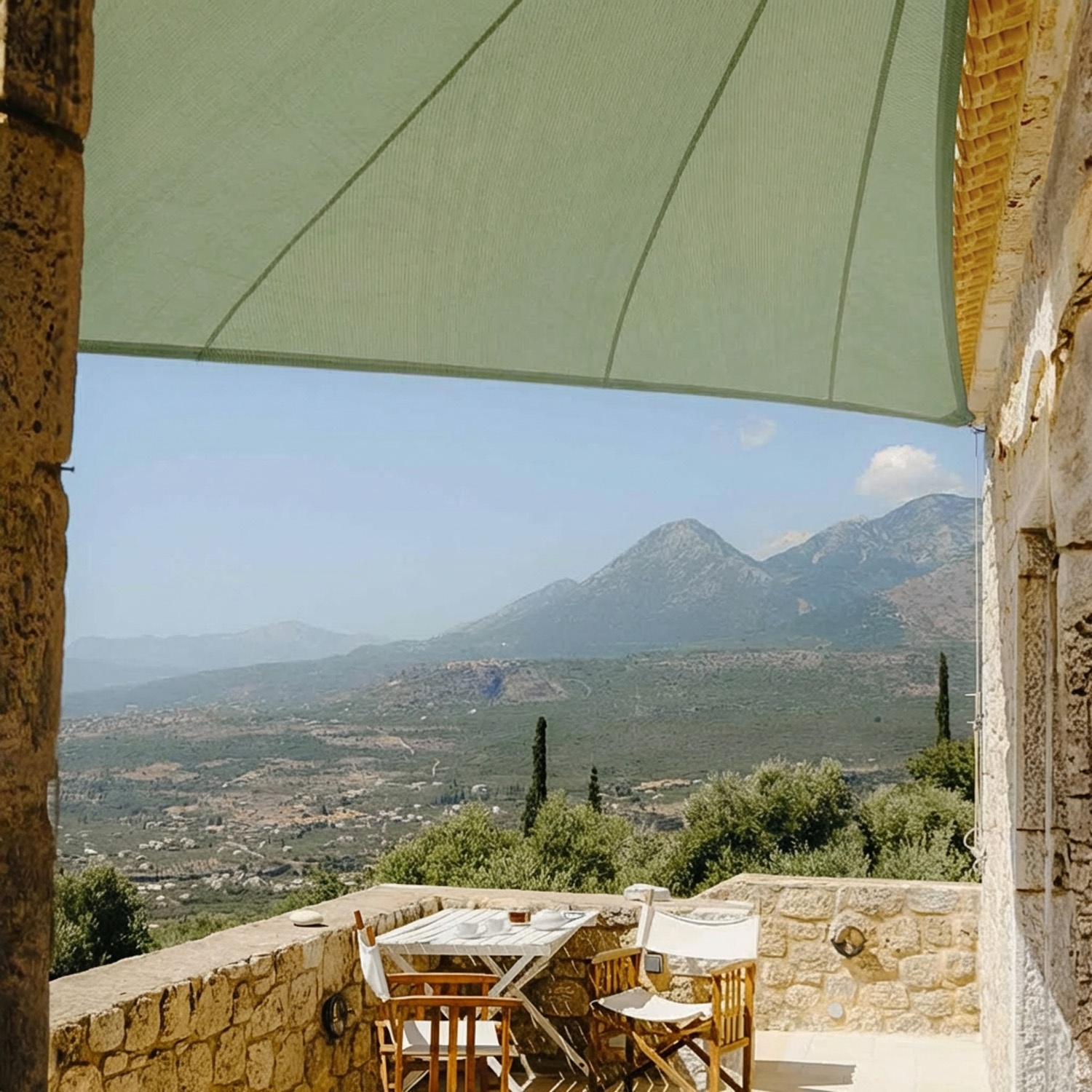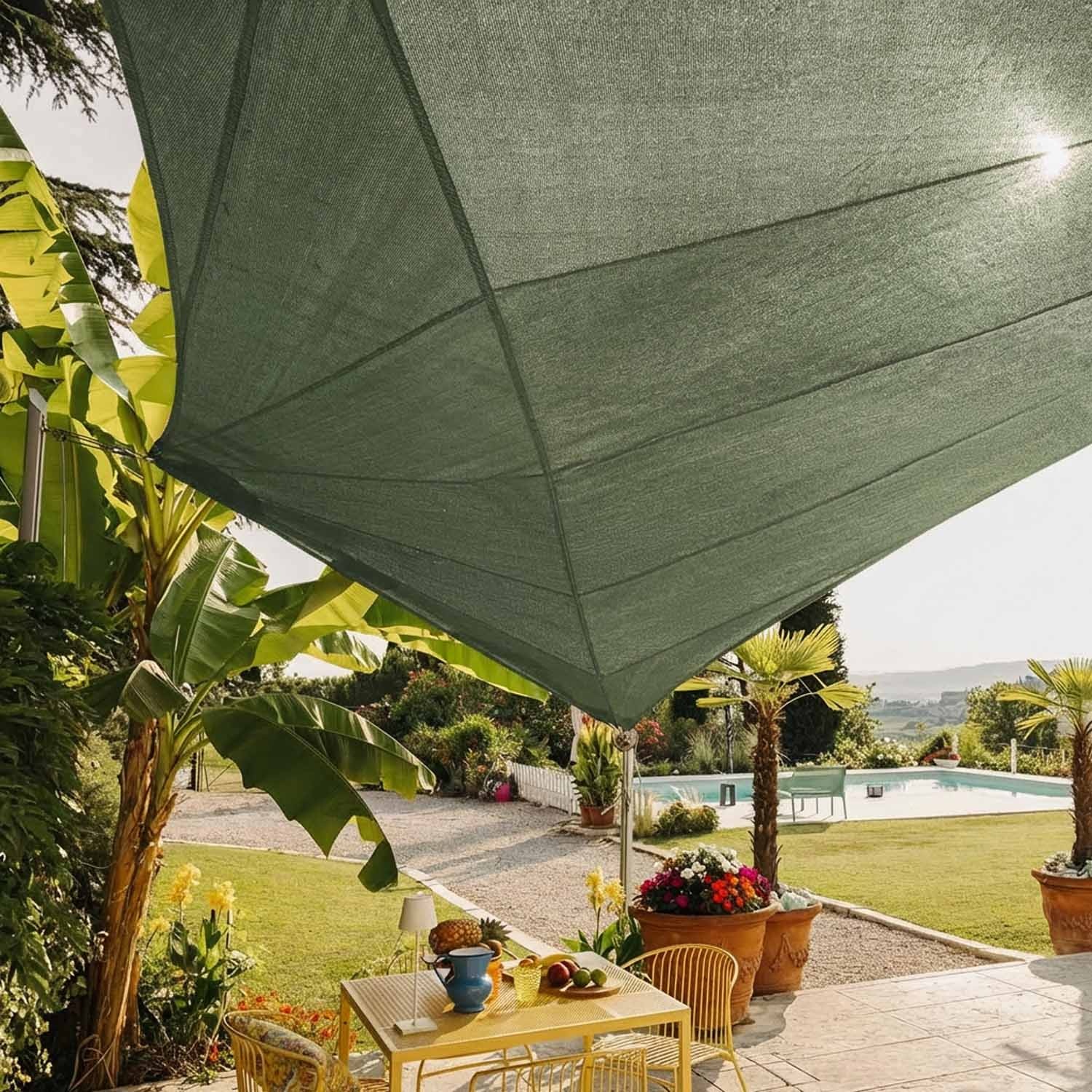 Das atmungsaktive Segel schafft einen luftigen Schattenbereich, der vor UV-Strahlen geschützt ist. Zugleich schützt es vor Hagel und Windböen.
