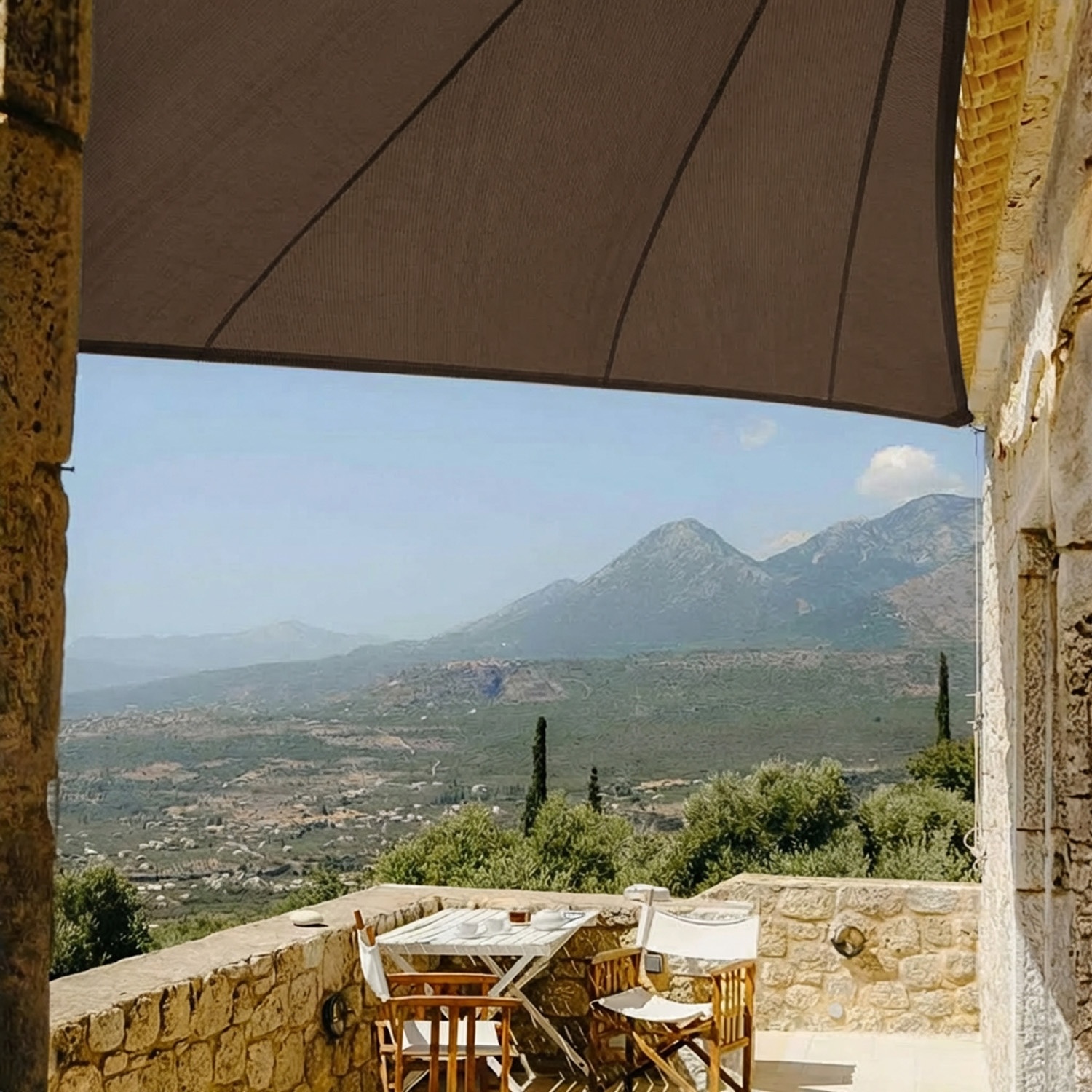 Das atmungsaktive Segel schafft einen luftigen Schattenbereich, der vor UV-Strahlen geschützt ist. Zugleich schützt es vor Hagel und Windböen.