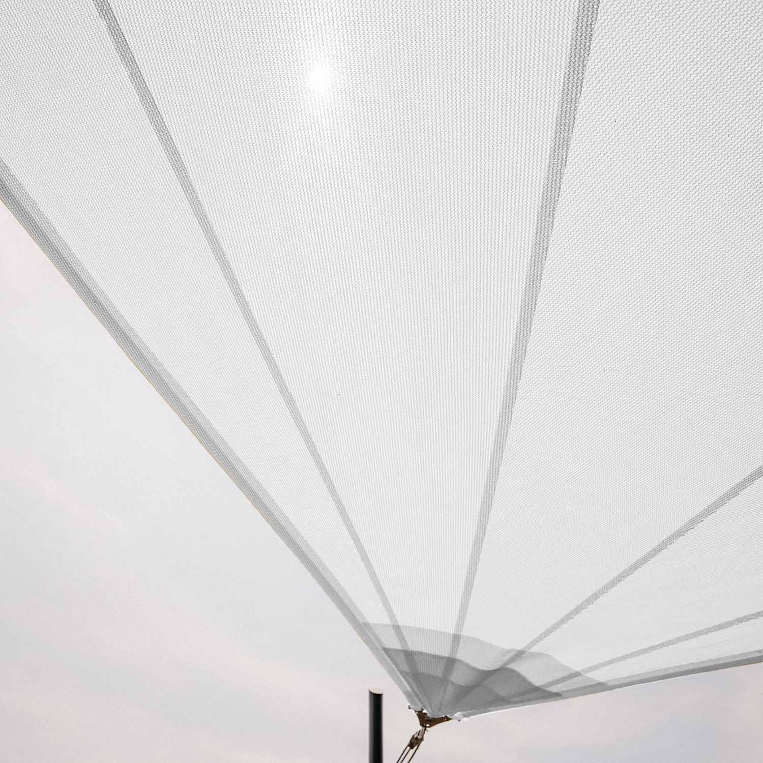 Solaria luftdurchlässig ist ein radial geschnittenes Sonnensegel aus luftdurchlässigem Meshnet® HDPE 320-Gewebe, das vor starker Hitze und Hagel schützt und auch hoher UV-Strahlung und starkem Wind standhält.