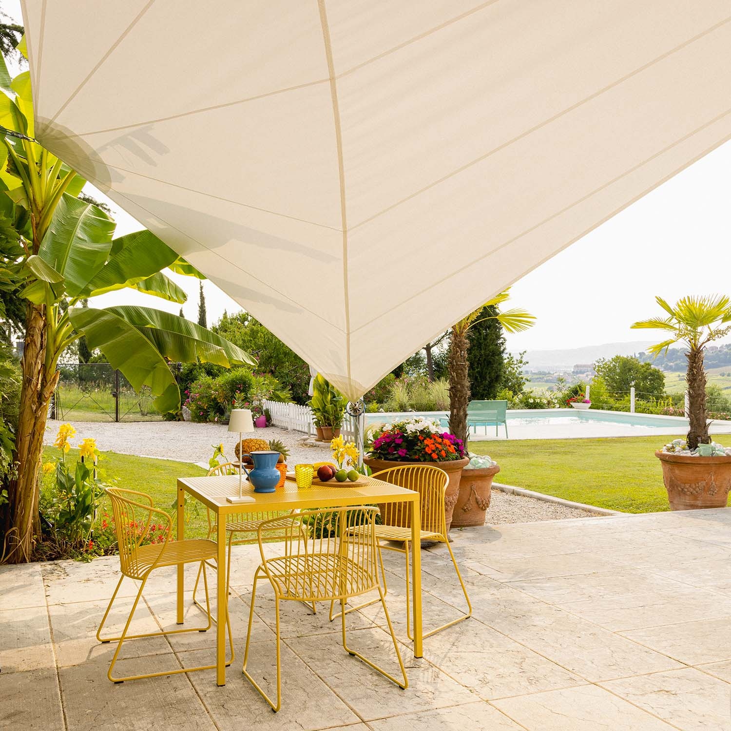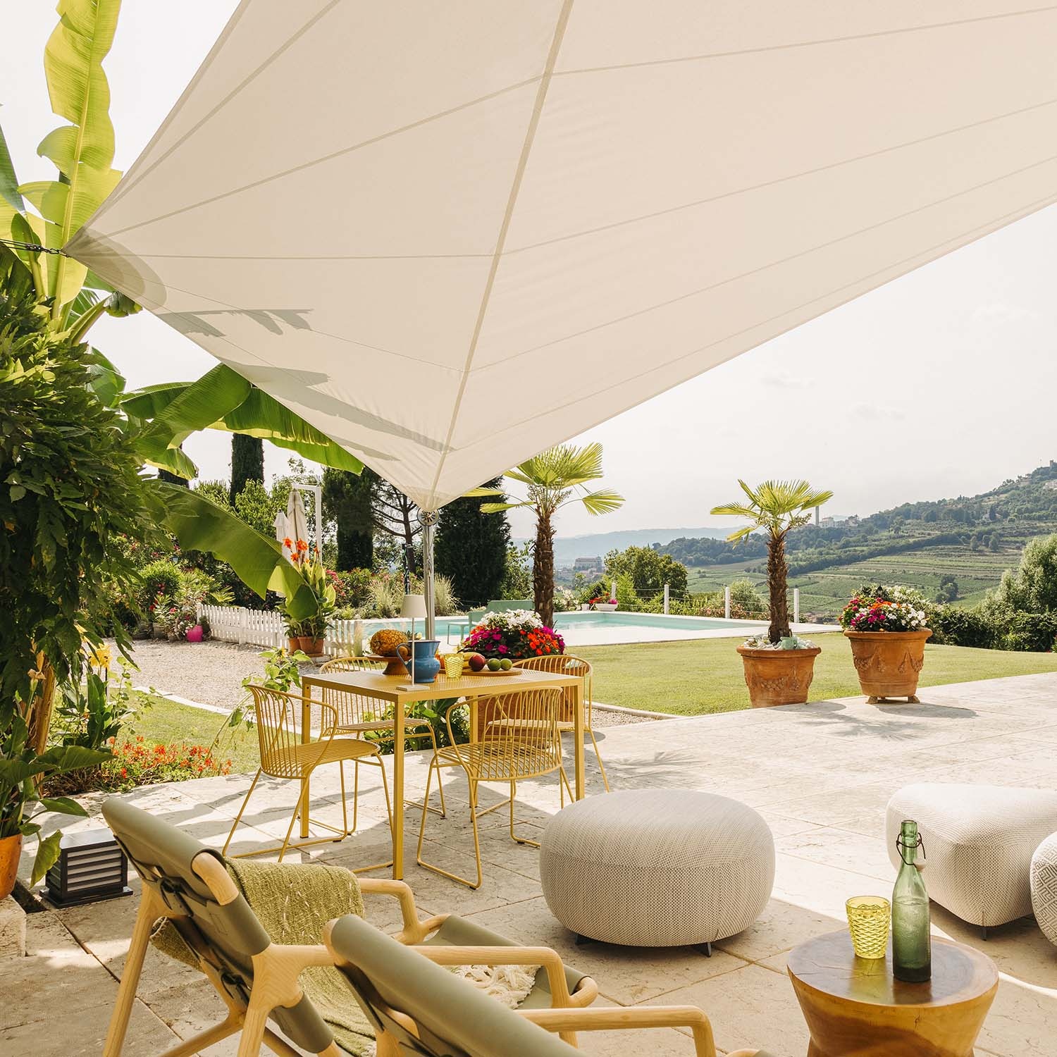 Das aufrollbare Sonnensegel Solaria Furl wasserdicht wird mit Radialschnitt mit dem Gewebe Purishade® hergestellt.