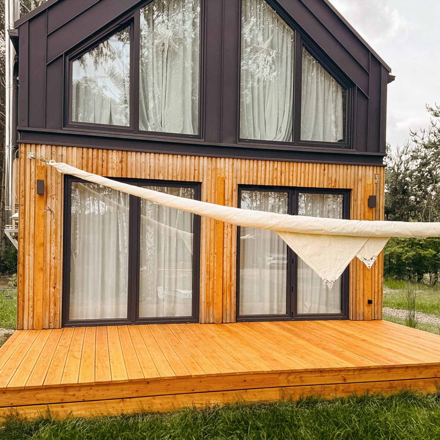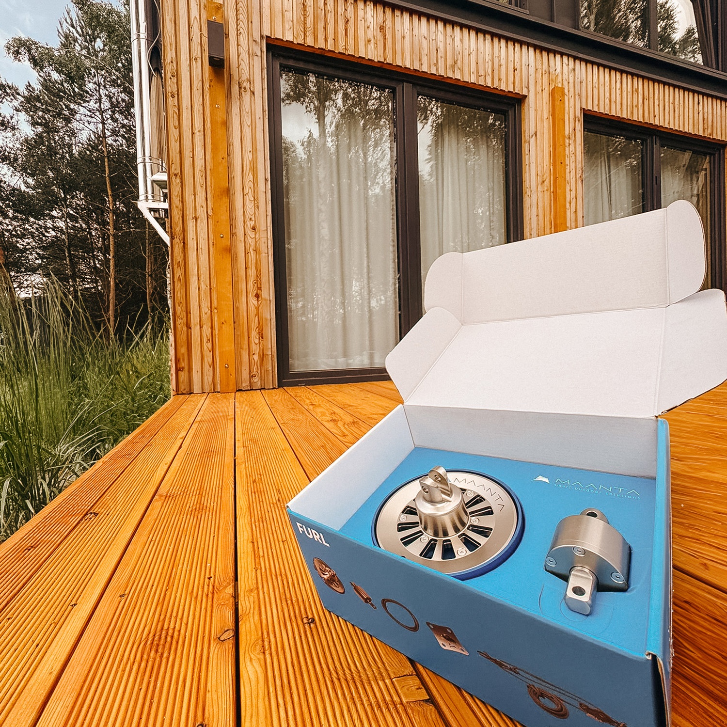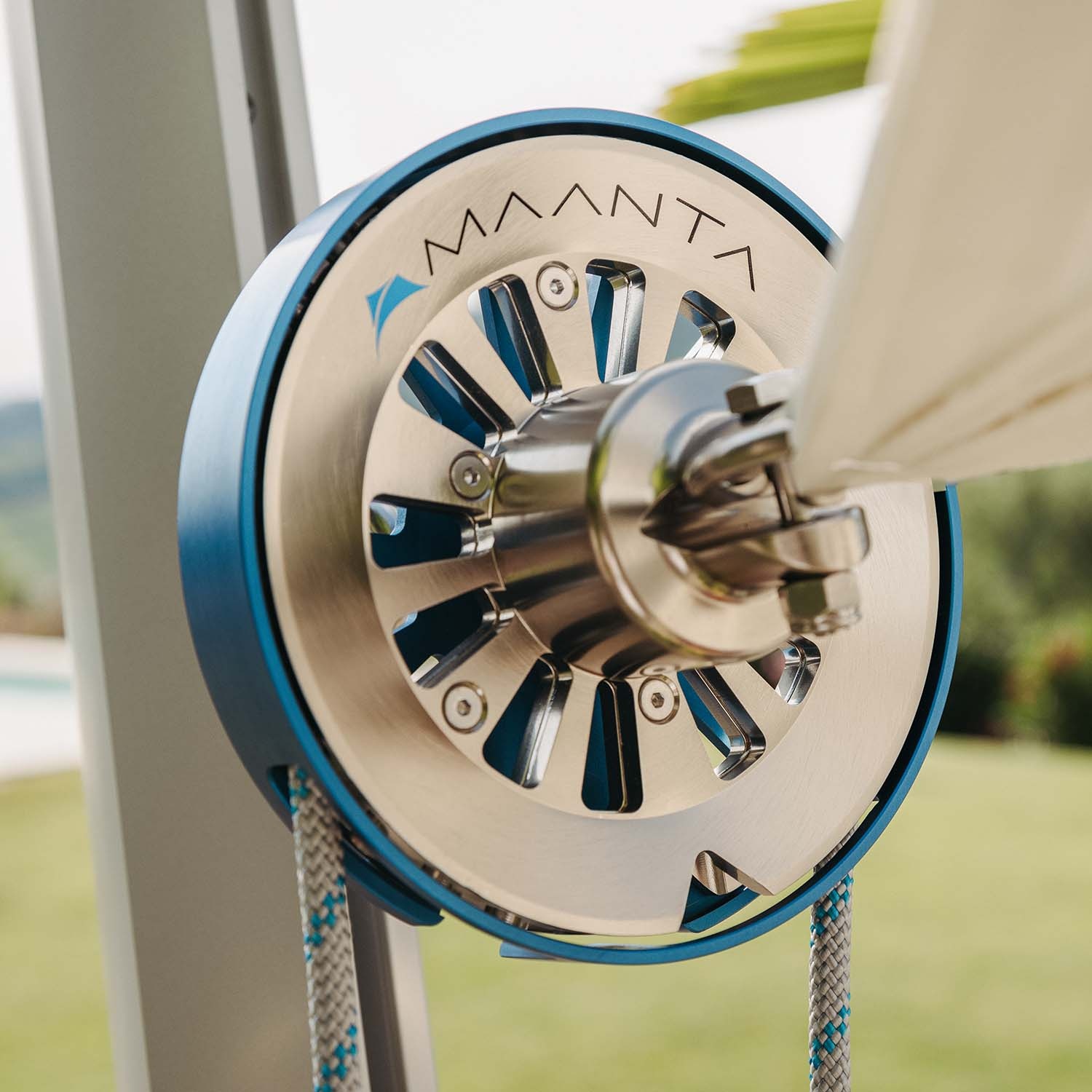Das manuell aufrollbare Sonnensegel Solaria Furl mit wasserdichtem Gewebe, kann durch das speziell von Maanta entwickelte Rollreff-System aufgerollt werden.