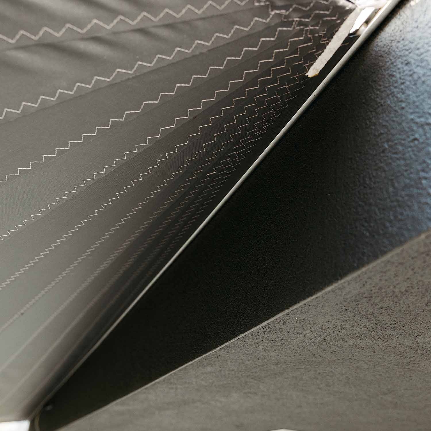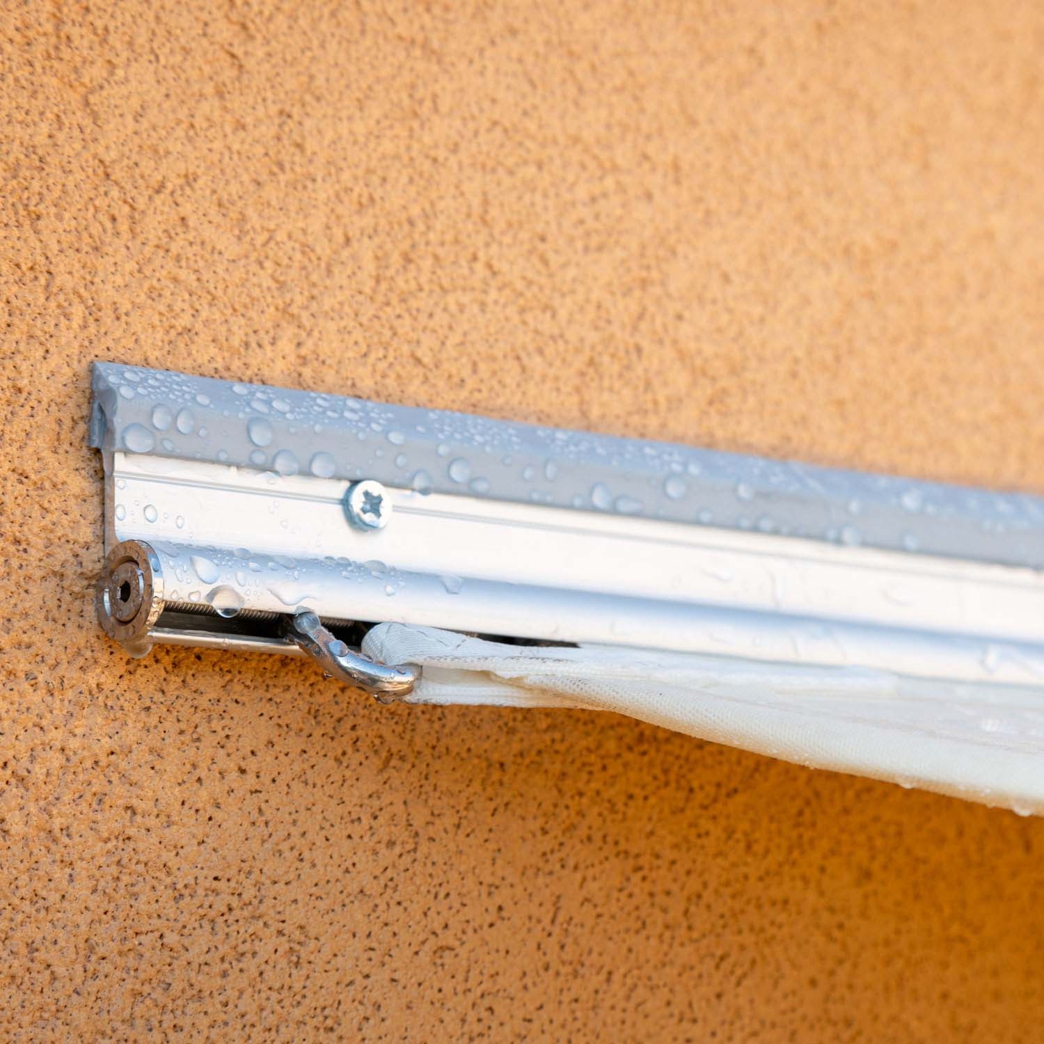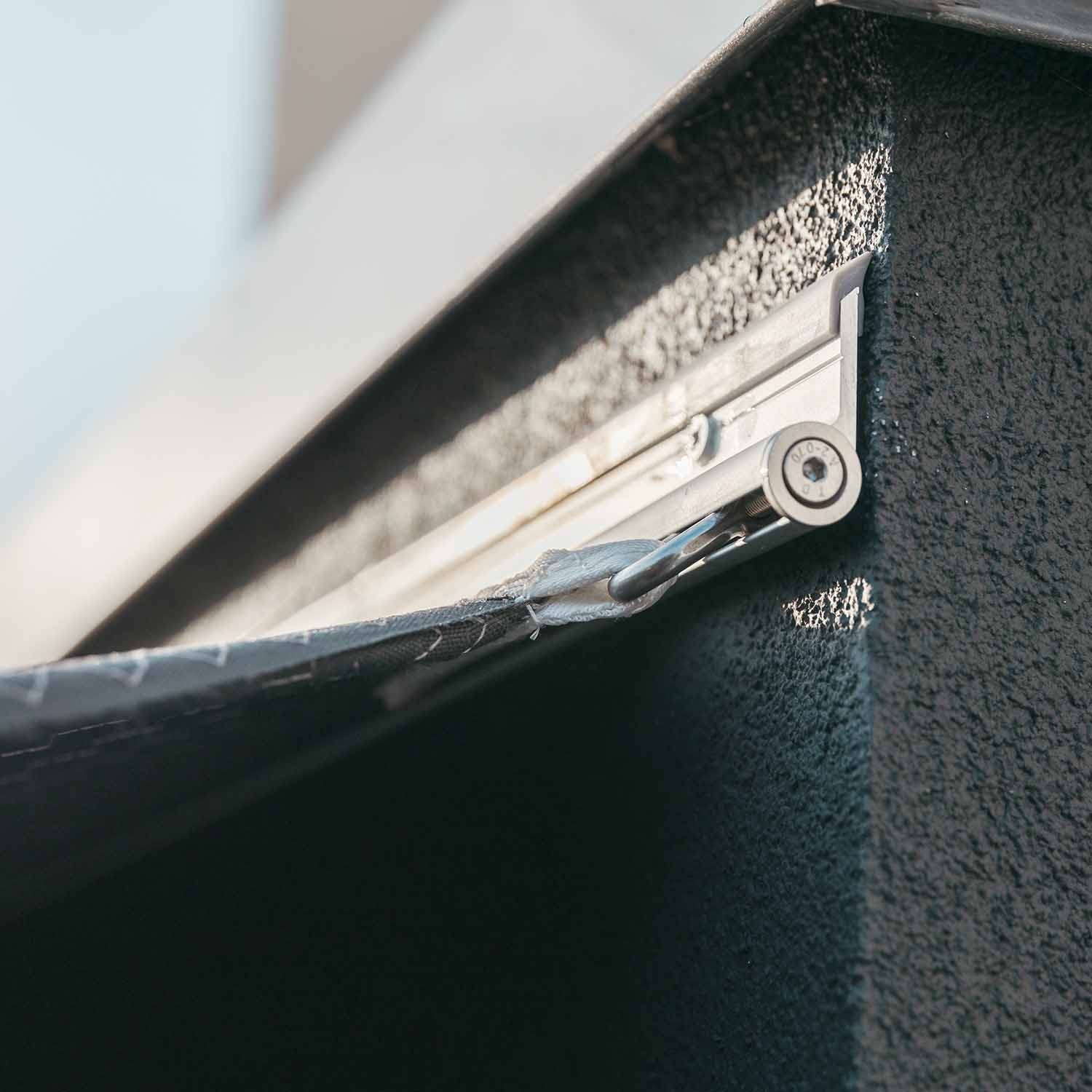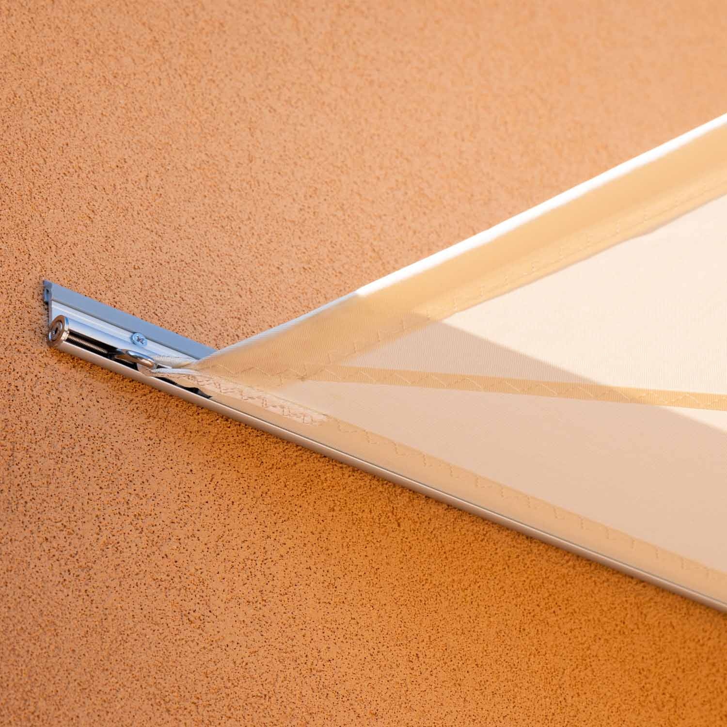 Das auf einer gerade geschnittenen Seite des Segels befestigte Aluminiumprofil lässt kein Regenwasser zwischen Segel und Wand durch.