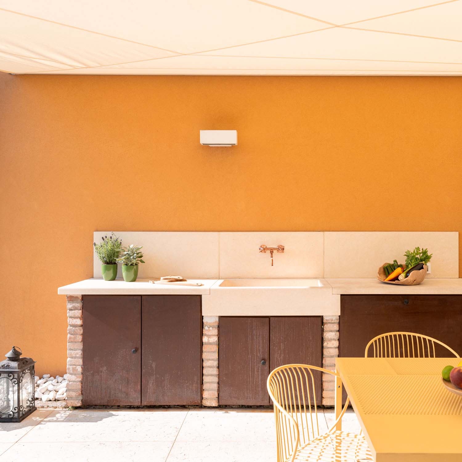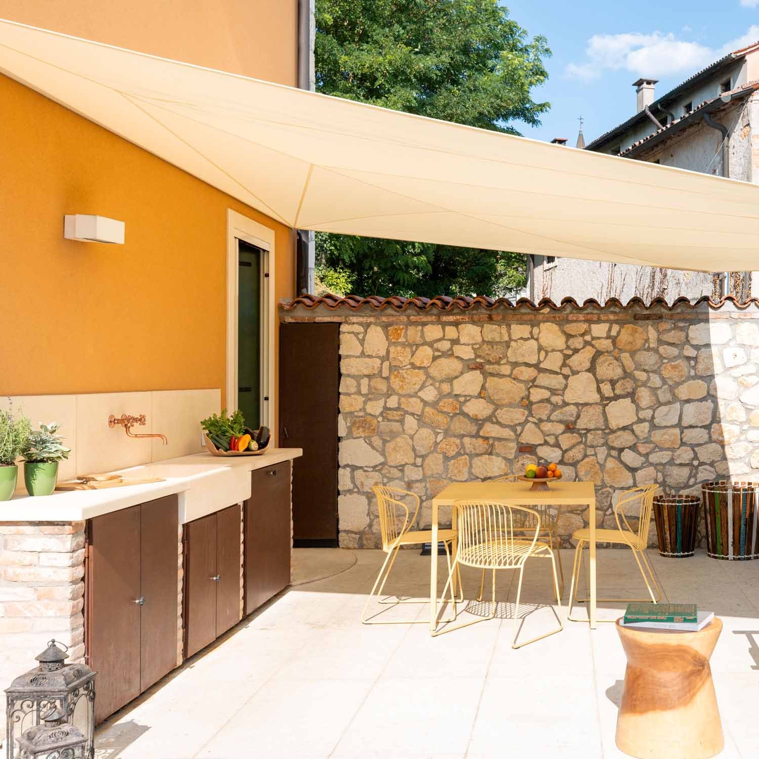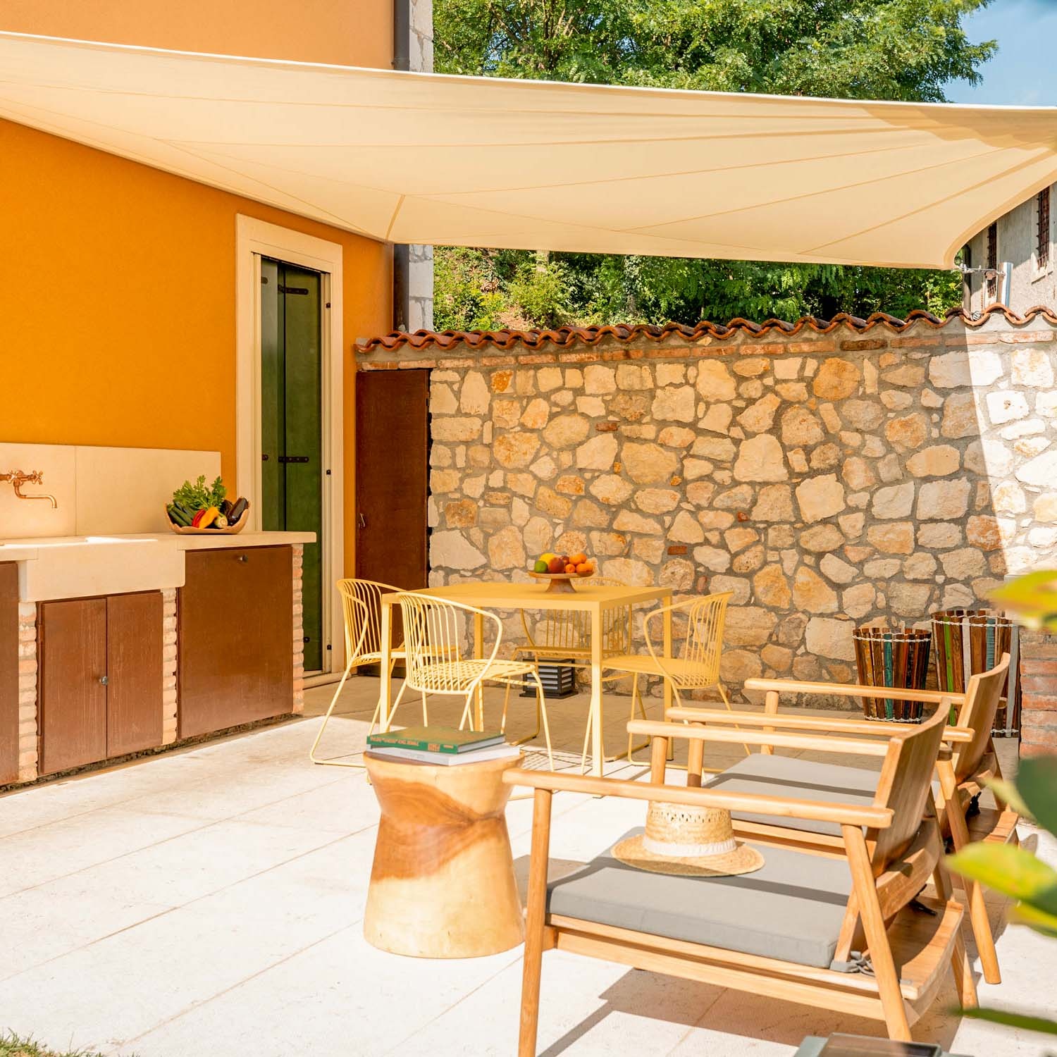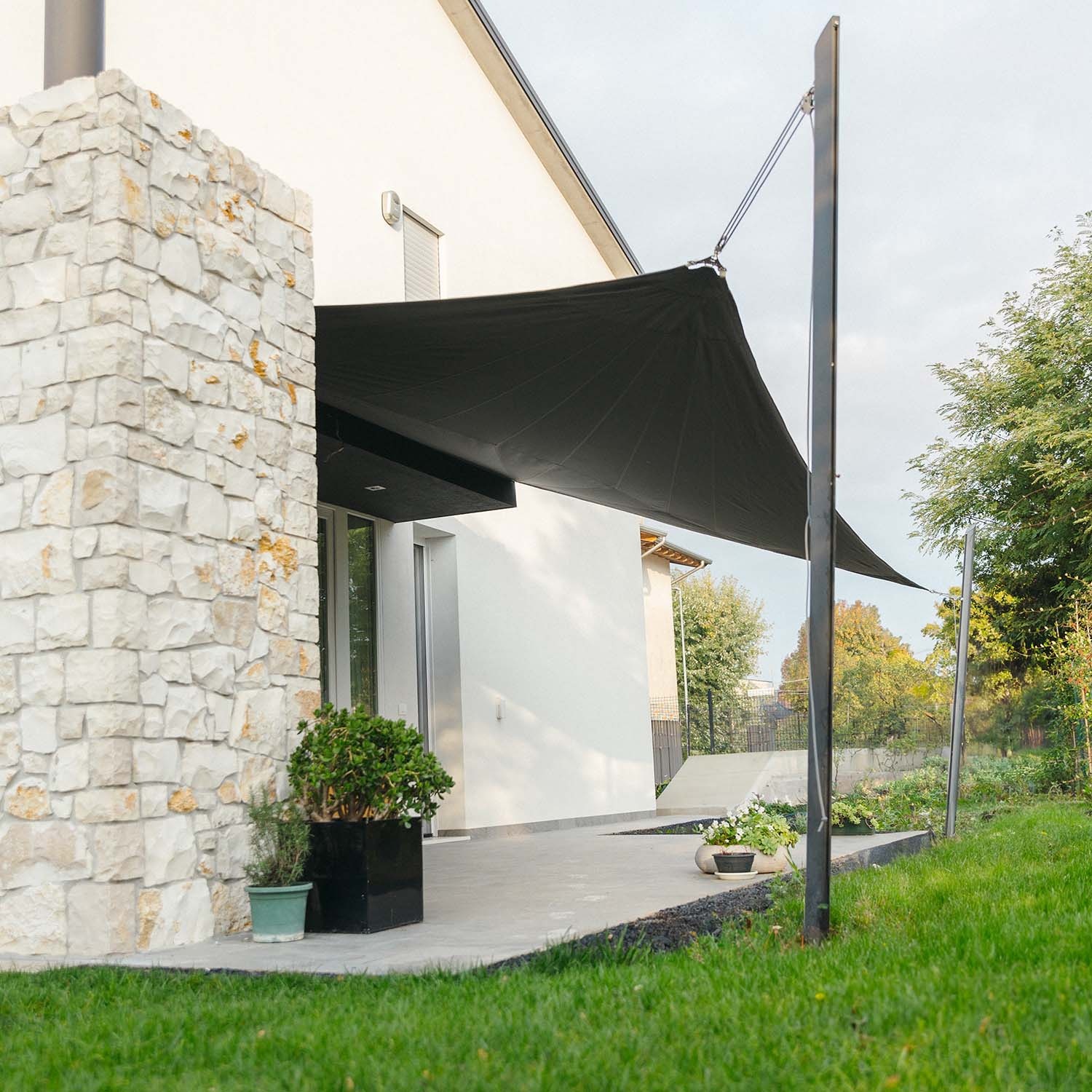 Die Befestigung einer Segelseite an der Hausmauer garantiert einen kompletten Schutz vor Niederschlag und maximalen Komfort auch bei starkem Regen.