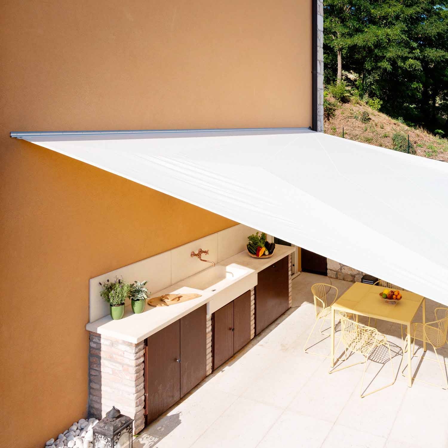 Aus dem Bedürfnis heraus, eine Seite des Segels bündig an der Hauswand zu befestigen, entstand Solaria Lean.